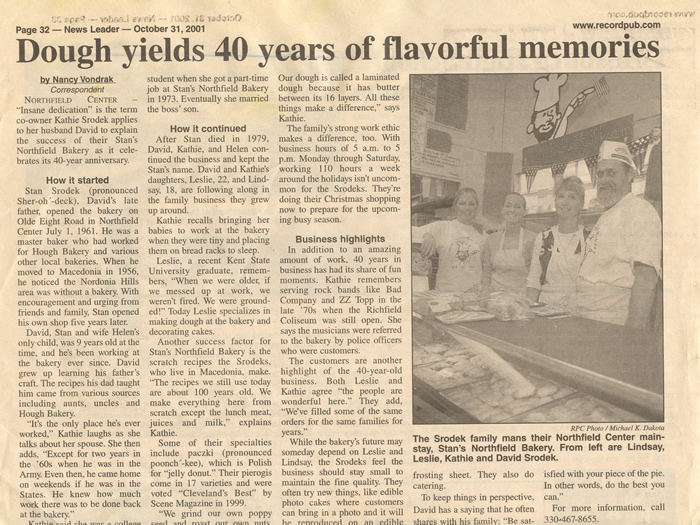 In July of 1961, Stan's Northfield Bakery was established by Stanley, Helen, and their son David. Their tradition of hard work and dedication has been maintained over the years. Today, David continues to run the family business with his wife Kathie and their two daughters, Leslie and Lindsay. As always, David, Kathie, Leslie and Lindsay remain committed to providing the community with quality, tasty, and scratch-made bakery.